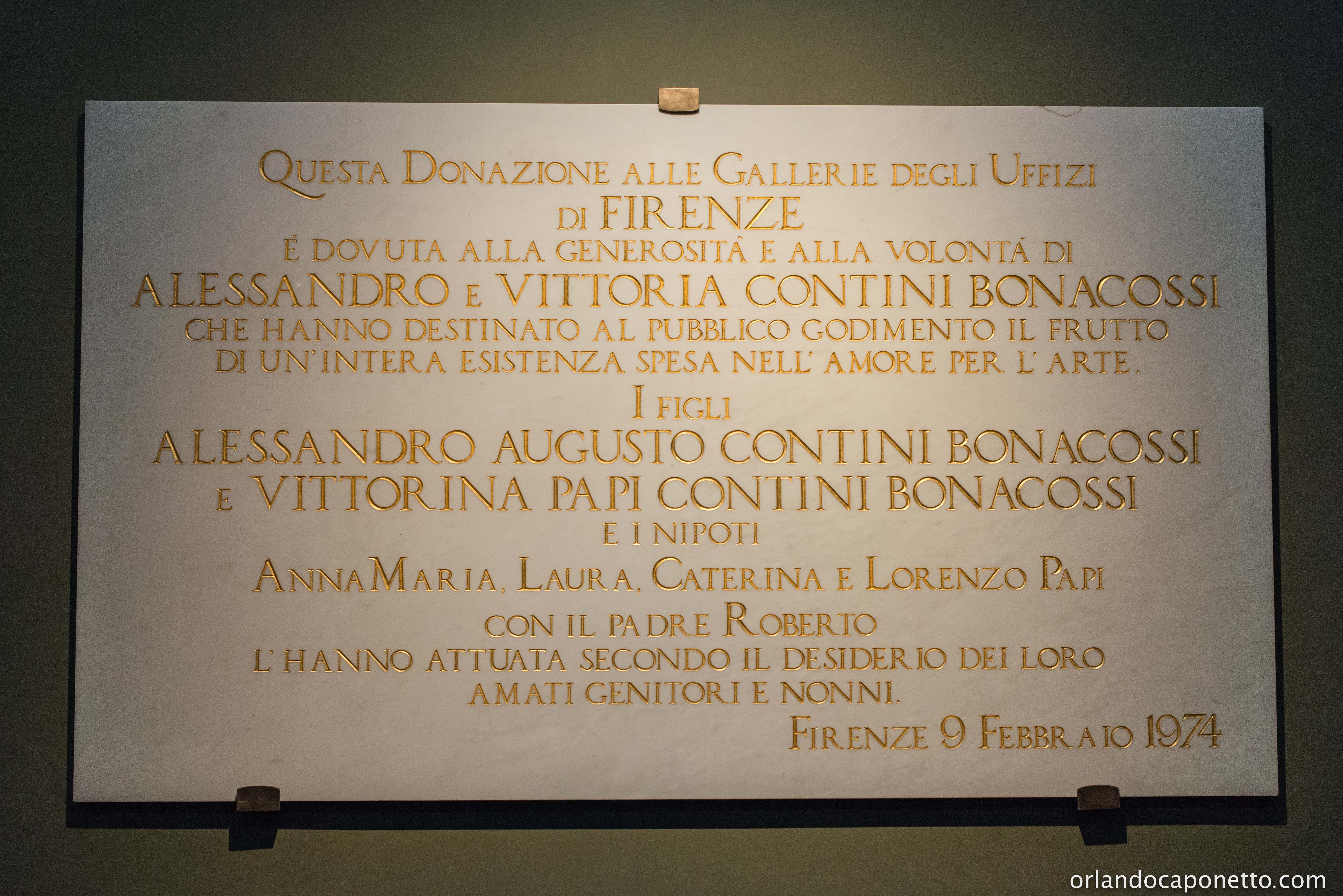Fotografie della Donazione Contini Bonacossi alla Galleria degli Uffizi, “dovuta alla generosità e alla volontà di Alessandro e Vittoria Contini Bonacossi hanno destinato al pubblico godimento il frutto di un intera esistenza spesa nell’amore per l’arte” e grazie “ai figli e i nipoti” – tra cui i miei bisnonni Roberto e Vittorina Papi e mia nonna Anna Maria Papi – “l’hanno attuata secondo il desiderio dei loro amati genitori e nonni” nel 1974.