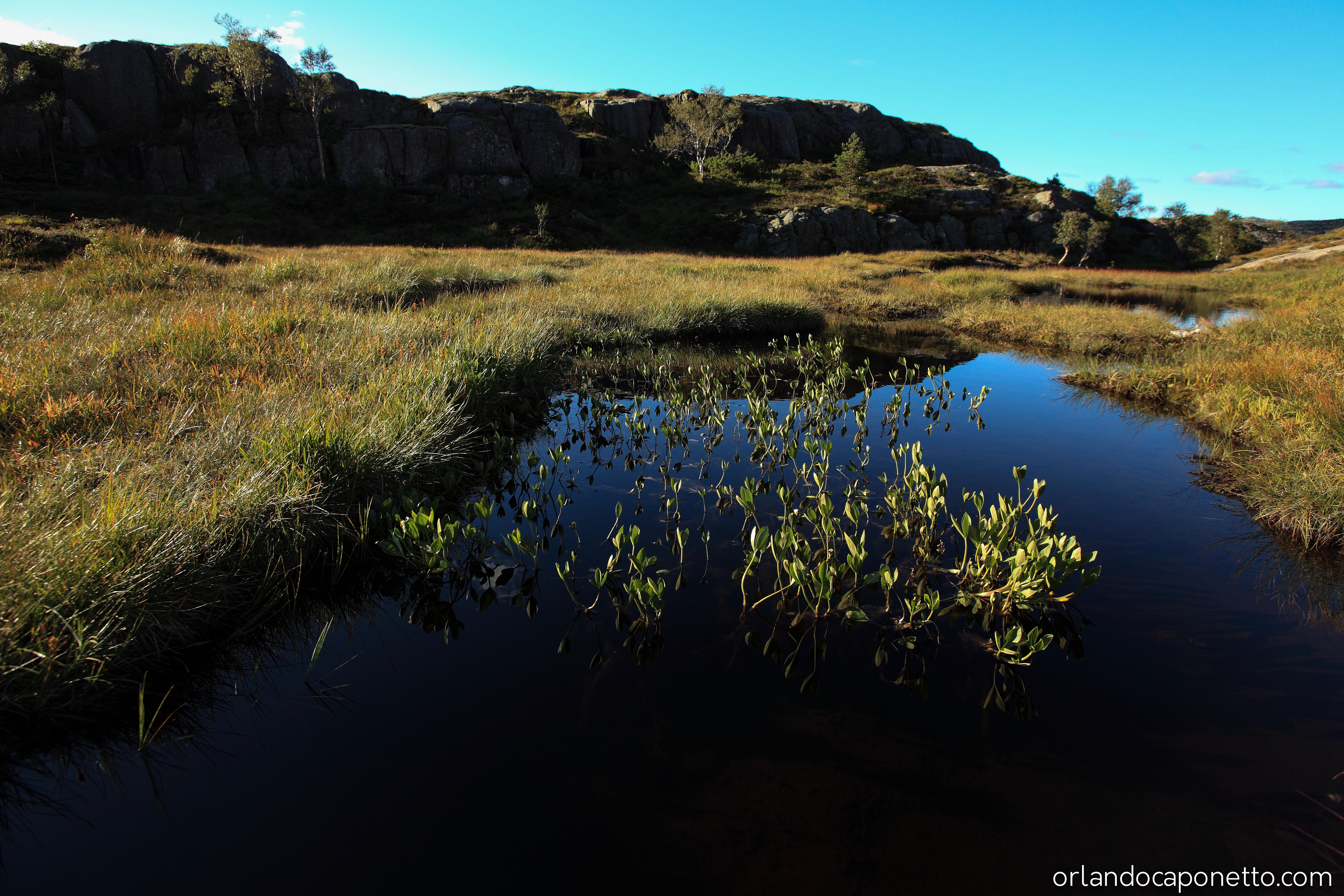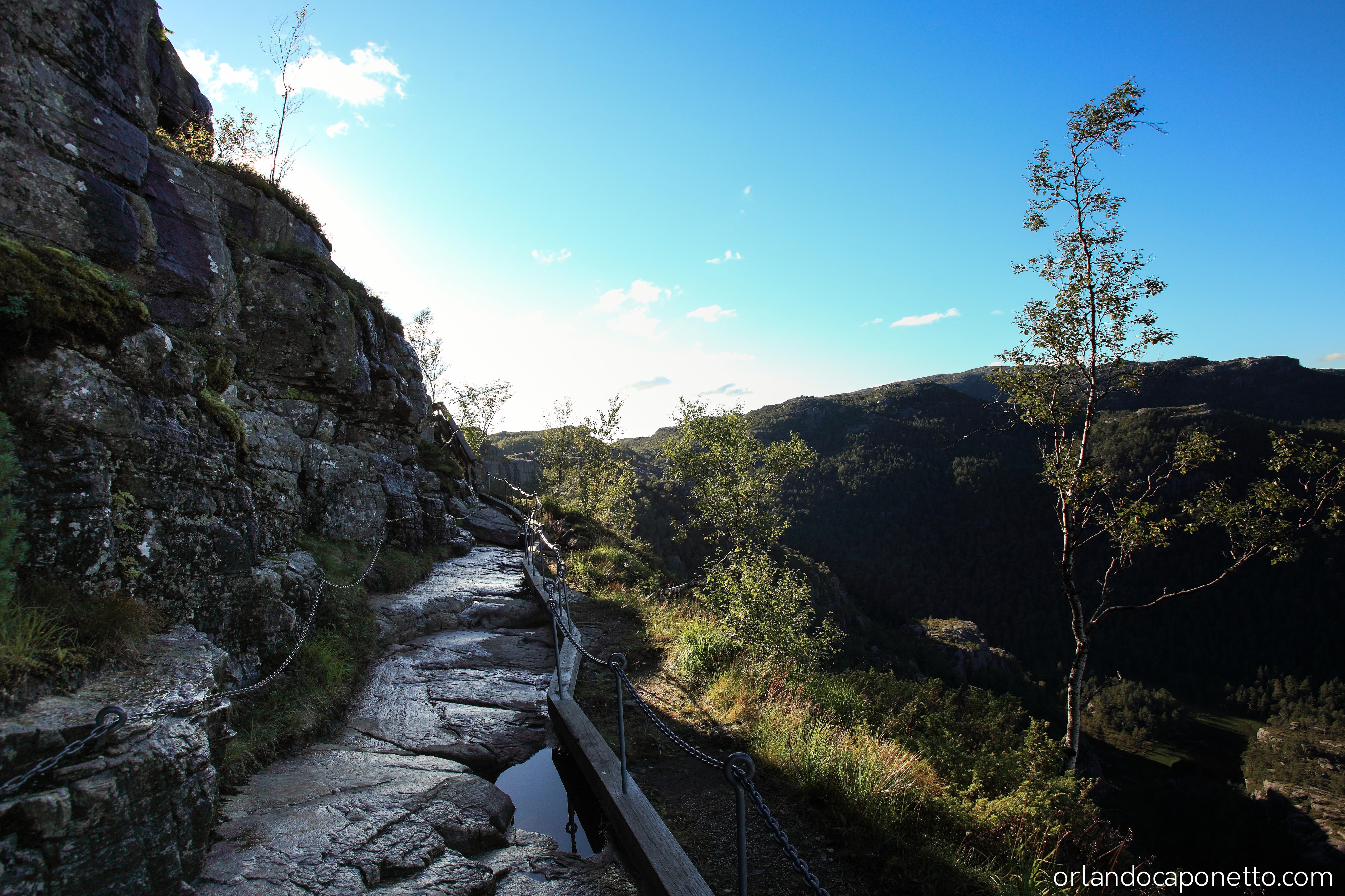 Nei primi giorni del viaggio, da Stavanger bbiamo subito raggiunto dopo una serie di meravigliosi paesaggi in macchina le strade della Norvegia sud occidentale, attraversando fiordi su traghetti che diventano affidabili compagni di viaggio, e scoprendo luoghi mai visti prima, siamo giunti all’inizio del percorso di 4km che parte dal piccolo lago di Resvatnet e che si inerpica su un primo tratto di area boschiva montana, poi attraversa un area di sentieri tra le rocce e che passano di fianco a piccolo lago in quota Tjødnane, arrivare nell’ultima parte ad una lunga scalinata di Flørli con ben 4444 gradini di legno da salire, e durante la quale si comincia piano piano ad ammirare con una grande emozione, il paesaggi unico che porta ad una tra le più celebri formazioni rocciose al mondo. Quando ci si avvicina con attenzione, e non senza qualche timore, alla plateau del Preikestolen (il pulpito), una falesia di granito alta 604 metri che si trova affacciata a strapiombo sul Lysefjord, il più grande fiordo della Norvegia, si prova una grande emozione di fronte a così tanta bellezza, e mentre si scorge da quella prospettiva unica un panorama incredibile e straordinario che ti lascia quasi senza fiato ci si accorge della nostra fragilità di esseri umani e dell’immensità e della grandezza della natura.