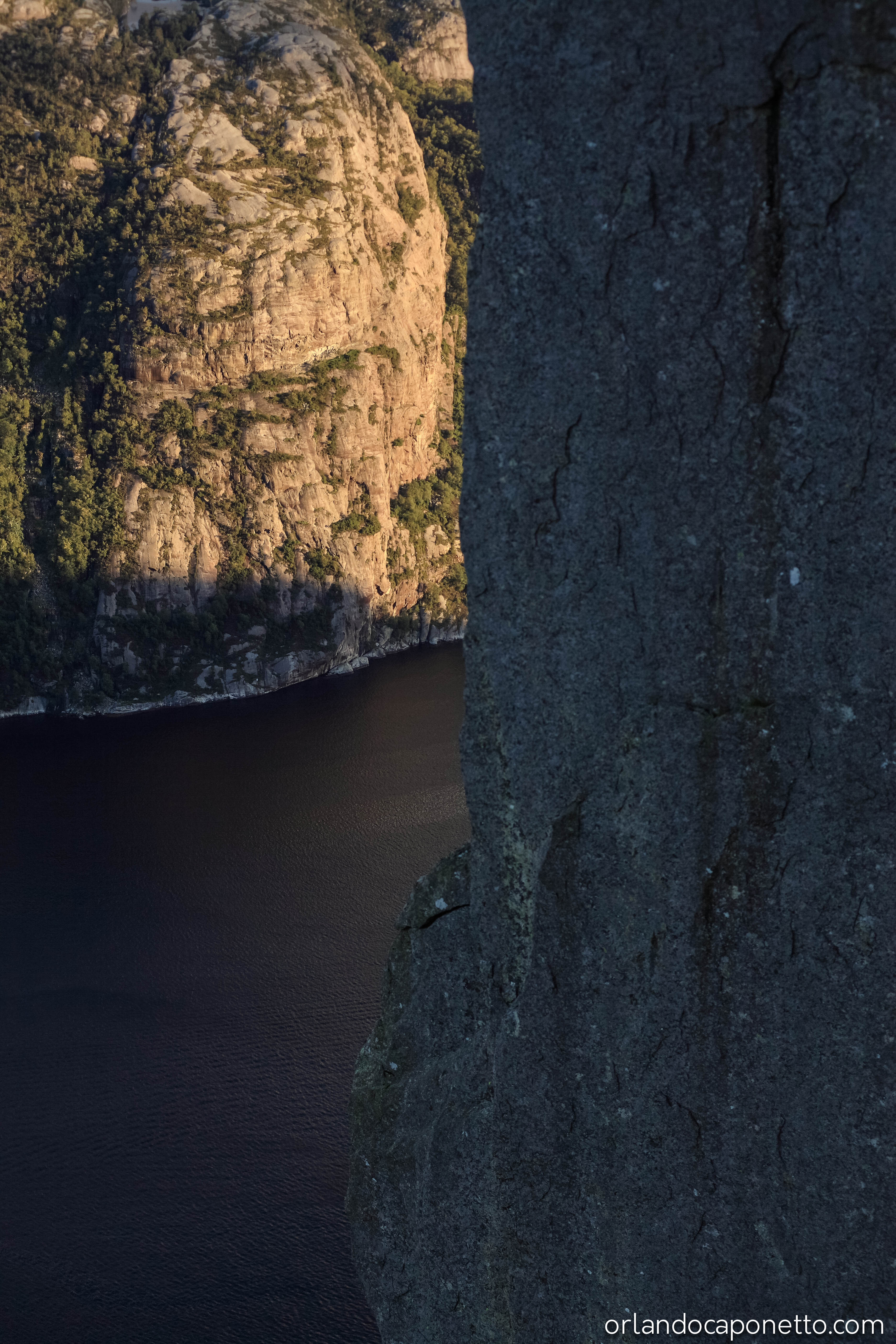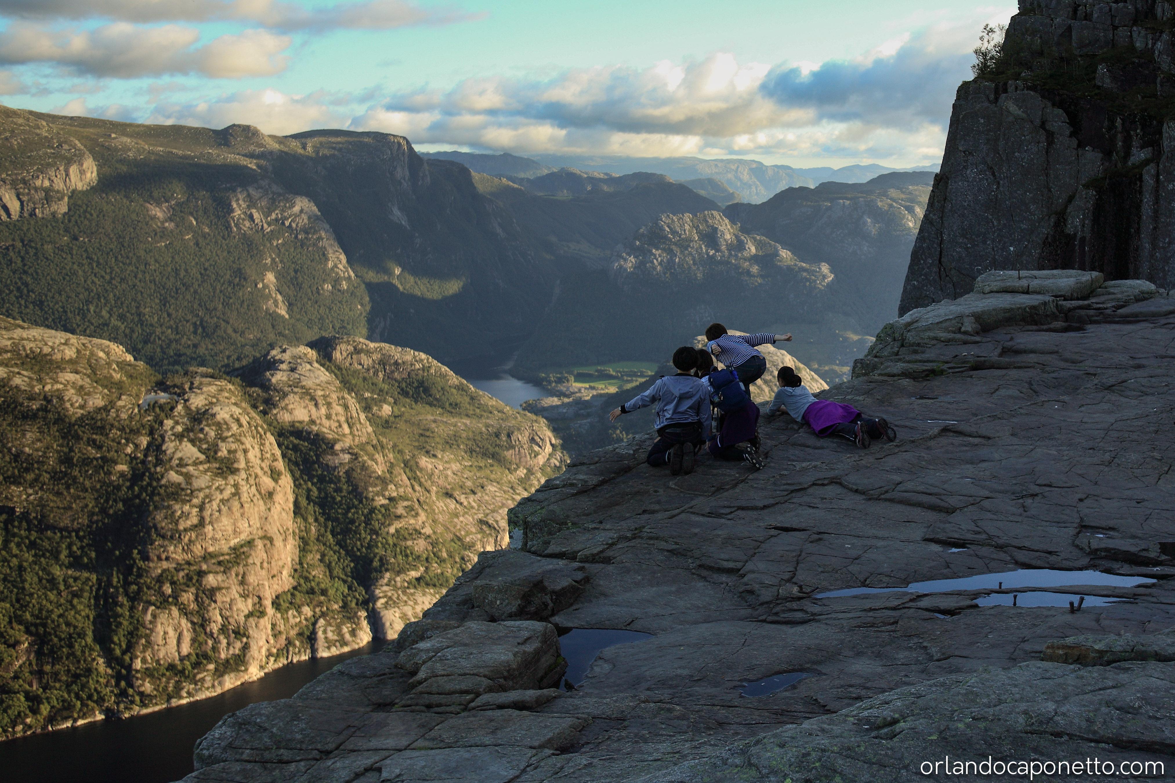 Salire fin a lassù ha richiesto non soltanto un po’ di fatica per attraversare un percorso semplice ma in alcuni punti anche impervio, ma soprattutto una bella dose di coraggio nell’ultimo tratto per salire e stare in piedi su quel pavimento naturale fatto di roccia scura e restare ad osservare di fronte a quel paesaggio immenso la potenza della natura per poi scorgere così vicino a noi, quel vuoto subito sotto che tra enormi fratture glaciali lasciavano intravedere il mare del fiordo sotto di noi così lontano e calmo, era davvero qualcosa di straordinario che insieme abbiamo vissuto, sostenendoci a vicenda e vivendo quel tempo breve, prima che arrivasse il tramonto e fossimo costretti ad affrontare la strada di ritorno prima che facesse buio, e alla fine con grande gioia siamo riusciti a stare su quella grande roccia famosa in tutto il mondo dove abbiamo riso e scherzato, e dove ho filmato e fotografato alcuni degli scatti presenti nelle gallerie.