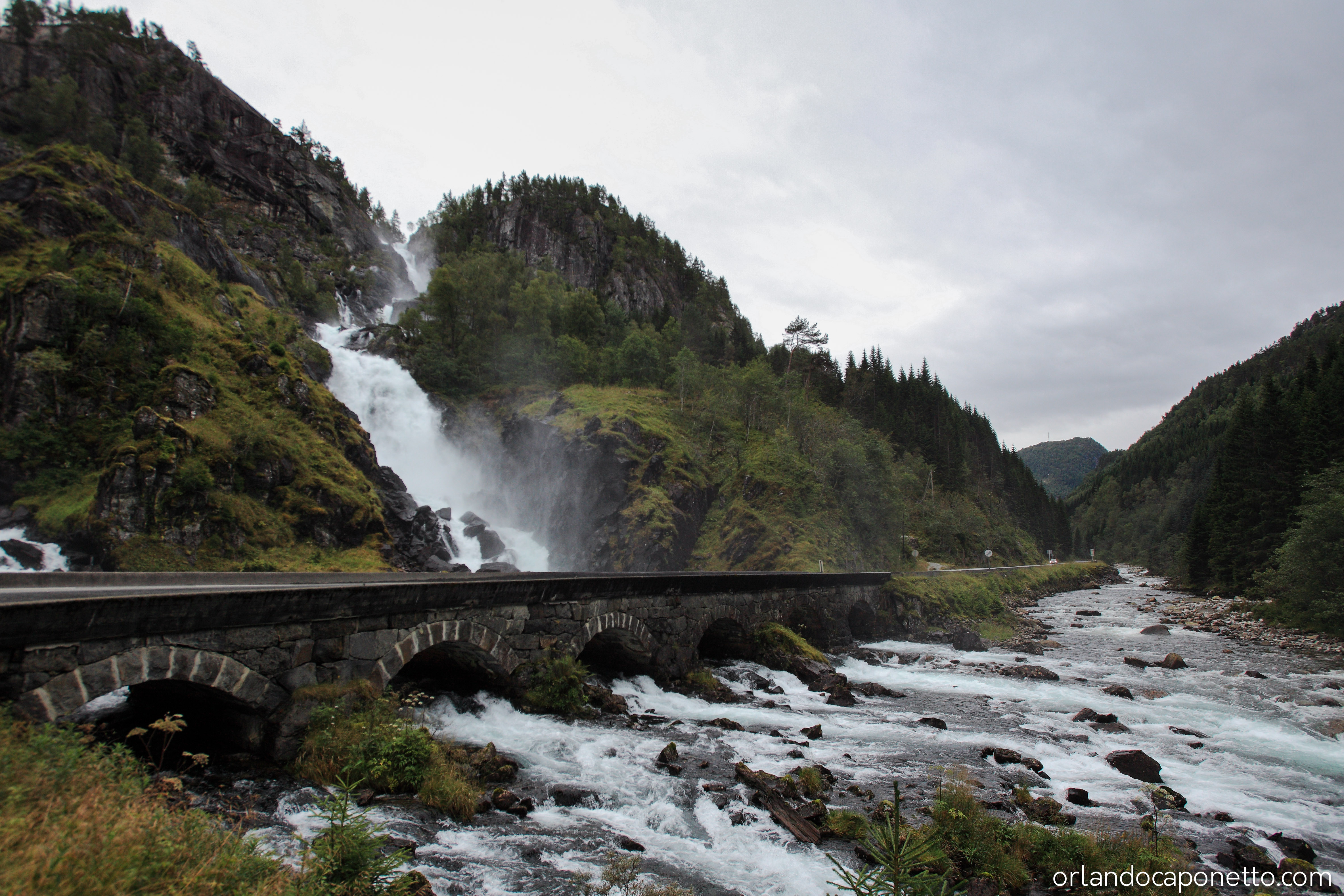 Proseguendo il viaggio a pochi chilometri di distanza abbiamo incontrato proprio a lato della strada le bellissime cascate di Latefossen le cui acque, altrettanto fragorose come le onde del mare sugli scogli, questa volta si gettano nel fiume Gronsdalslona passando sotto un antico ponte in pietra dove sono circondate ancora da una natura piena di emozione.