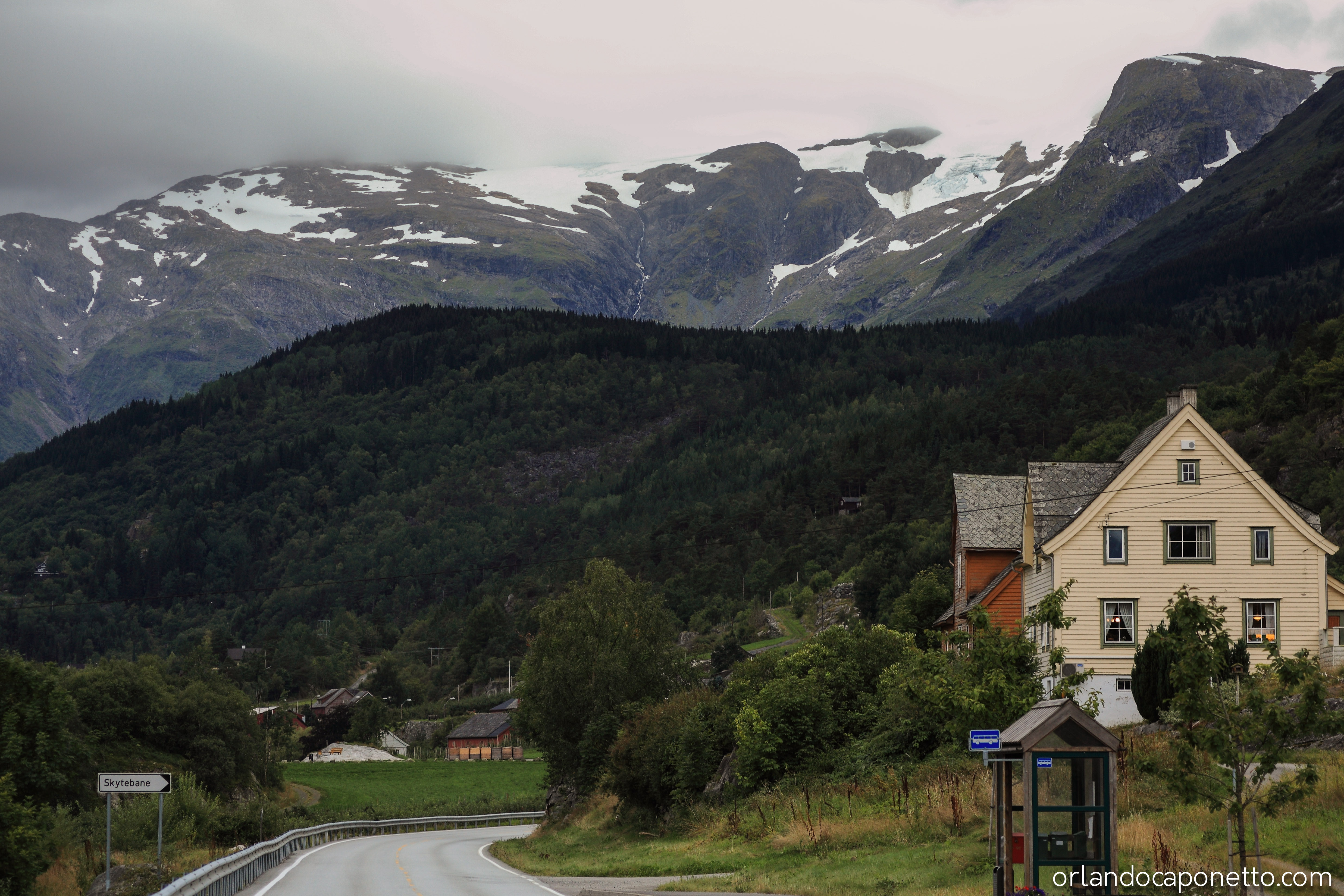 E così una volta lasciate alle spalle quelle due meravigliose cascate, credendo di essere già stati molto fortunati ad averle viste, ad un tratto voltandoci a guardare, alla nostra sinistra, silenziosamente ci è apparso in tutta la sua maestosa presenza e quasi facendo capolino tra due enormi montagne ricoperte di alberi verdi, in una luce bianca e appena avvolta da una nebbia in quota, il grande ghiacciaio del Folgefonna National Park. Il Folgefonna è il terzo ghiacciaio della Norvegia per estensione ed è costituito da tre ghiacciai separati, il Nordre Folgefonna, il Midtre Folgefonna e il Søndre Folgefonna, tutti situati nella contea di Vestland.